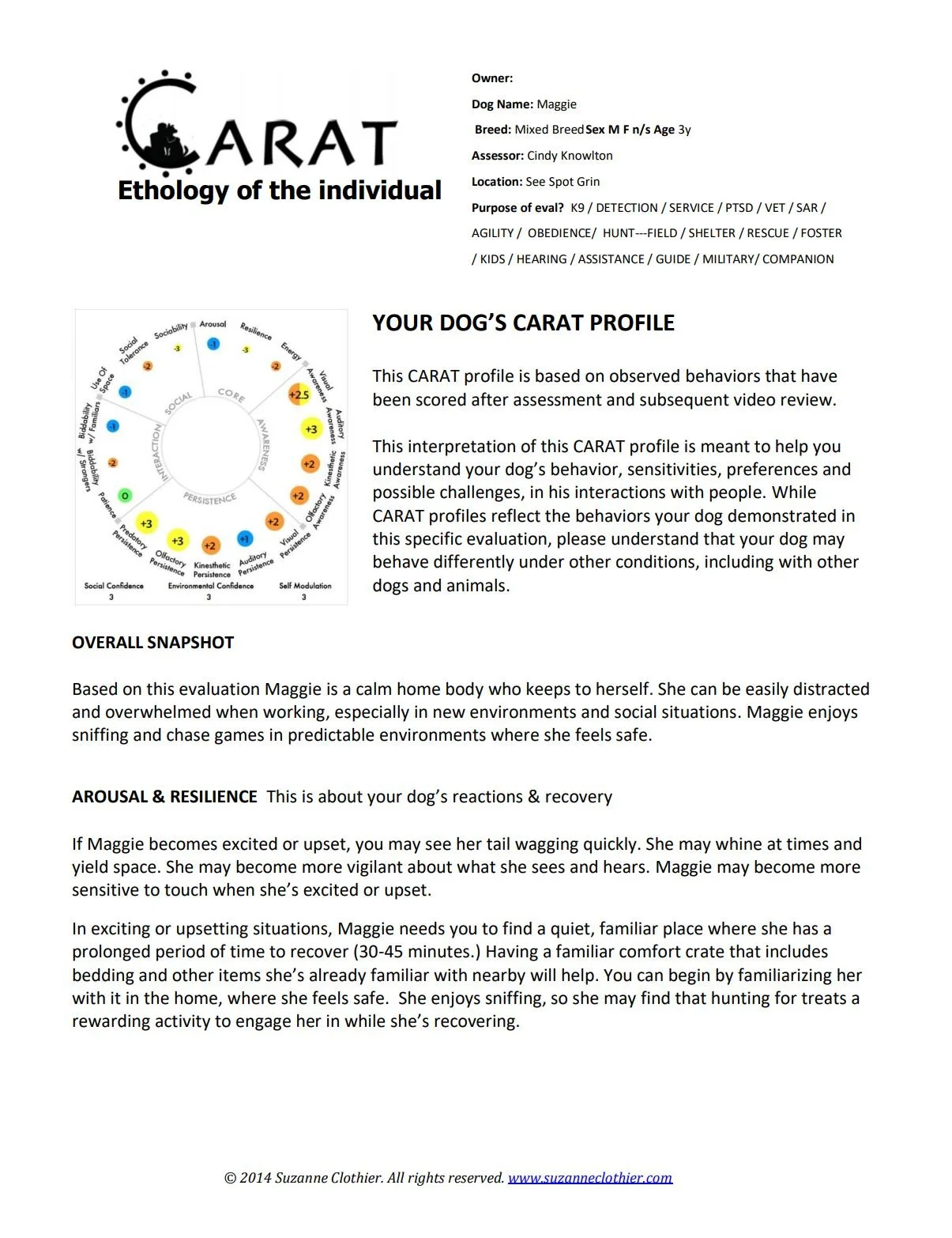 Developed by Suzanne Clothier in 2007, CARAT (Clothier Animal Response Assessment Tool) is a novel assessment system that categorizes behavior traits in multiple components that are intuitive and practical.